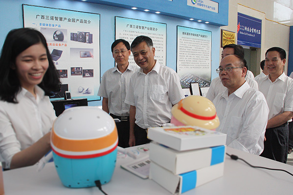 在園區(qū)展示廳,于春生聽取了北海工業(yè)園區(qū)管委會(huì)主任朱會(huì)東對(duì)北海市打造千億元電子信息產(chǎn)業(yè)規(guī)劃,中國(guó)電子北海產(chǎn)業(yè)園發(fā)展進(jìn)程匯報(bào)以及下一步以信息服務(wù)業(yè)為主導(dǎo),以智能硬件和創(chuàng)意設(shè)計(jì)為重要支撐產(chǎn)業(yè),政企聯(lián)合共建中國(guó)電子北部灣信息港的規(guī)劃介紹,陪同參觀了園區(qū)長(zhǎng)城能源、冠捷科技、三諾電子等企業(yè)產(chǎn)品。在園區(qū)企業(yè)三諾電子產(chǎn)品體驗(yàn)區(qū),饒有興趣的聽取了工作人員對(duì)新穎的數(shù)碼音響產(chǎn)品演示及介紹。在創(chuàng)業(yè)成果展示區(qū),于春生觀看了園區(qū)管委會(huì)、科技局、產(chǎn)業(yè)園三方合作共建的北部灣孵化器創(chuàng)業(yè)企業(yè)科遙奇智能機(jī)械手演示,聽取了蘊(yùn)芯科技電子芯片產(chǎn)品專利技術(shù)介紹、產(chǎn)品銷售及推廣,了解了會(huì)圈紅包的互聯(lián)網(wǎng)+營(yíng)銷模式,鼓勵(lì)創(chuàng)業(yè)青年以市場(chǎng)為導(dǎo)向,結(jié)合自有特色,抓住產(chǎn)業(yè)發(fā)展機(jī)遇做大做強(qiáng)。當(dāng)于春生得知科遙奇、海云智慧等好幾家創(chuàng)業(yè)企業(yè)在國(guó)家、自治區(qū)一級(jí)創(chuàng)業(yè)大賽上榮獲嘉獎(jiǎng),蘊(yùn)芯科技、瀟鳴進(jìn)出口貿(mào)易等企業(yè)產(chǎn)品訂單源源不斷暢銷國(guó)內(nèi)外市場(chǎng)時(shí),于春生對(duì)園區(qū)發(fā)展電子信息制造業(yè)的同時(shí),重視中小微企業(yè)創(chuàng)業(yè)創(chuàng)新,并取得積極成效給予充分肯定,對(duì)中國(guó)電子發(fā)揮電子信息國(guó)家隊(duì)帶動(dòng)作用,引領(lǐng)龍頭企業(yè)集聚北海,實(shí)現(xiàn)了北海電子信息產(chǎn)業(yè)量與質(zhì)的飛躍,對(duì)地方產(chǎn)業(yè)結(jié)構(gòu)調(diào)整中的貢獻(xiàn)給予充分肯定,稱贊了園區(qū)良好的發(fā)展環(huán)境。臨行前,于春生囑咐園區(qū)繼續(xù)加強(qiáng)陽(yáng)光工程建設(shè),以務(wù)實(shí)的工作作風(fēng),嚴(yán)明紀(jì)律,打造一個(gè)陽(yáng)光、優(yōu)質(zhì)的千億元電子信息產(chǎn)業(yè)基地。