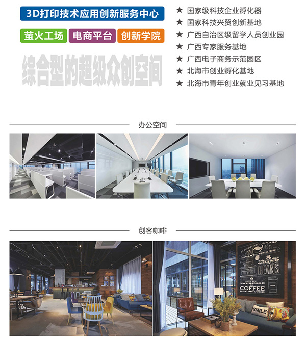 中電北海產(chǎn)業(yè)園眾創(chuàng)空間規(guī)劃面積5000平方米,重點圍繞智慧城市、智能硬件、物聯(lián)網(wǎng)、移動互聯(lián)網(wǎng)、大數(shù)據(jù)、電子商務等重點新型產(chǎn)業(yè)領域,采取互聯(lián)網(wǎng)+現(xiàn)場服務的模式,整合上下游資源,為入住企業(yè)和創(chuàng)業(yè)者提供政策咨詢、科研支持、人才引進、電商培訓、創(chuàng)業(yè)指導、融資對接等服務,形成支持創(chuàng)新創(chuàng)業(yè)的生態(tài)圈。中電北海產(chǎn)業(yè)園眾創(chuàng)空間通過整合各方資源,已經(jīng)集成一批面向區(qū)域主導產(chǎn)業(yè)的前沿技術,整合了戰(zhàn)略投資基金、天使基金和社會投資相結(jié)合的創(chuàng)新創(chuàng)業(yè)投資基金,建立了涵蓋科學家、創(chuàng)業(yè)企業(yè)家和企業(yè)運營管理專家的創(chuàng)業(yè)導師團隊,聚集電商平臺、3D打印技術應用創(chuàng)新服務中心、創(chuàng)新學院、螢火工場實驗室等一體化服務機構構成綜合型的超級眾創(chuàng)空間。