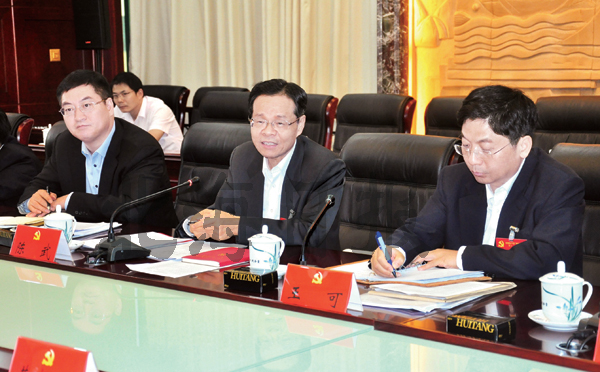 圖片說明:11月21日下午,陳武、王可、李延強(qiáng)同志參加自治區(qū)第十一次黨代會北海市代表團(tuán)全體會議,與大家一起審議彭清華同志代表中國共產(chǎn)黨廣西壯族自治區(qū)第十屆委員會所作的報告。北海日報記者 扶建邦 攝